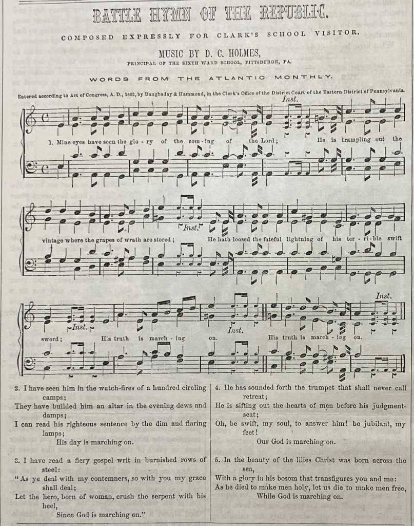 5 – Holmes, D. C. “Battle Hymn of the Republic,” Clark’s School Visitor, July 1862, page 112.