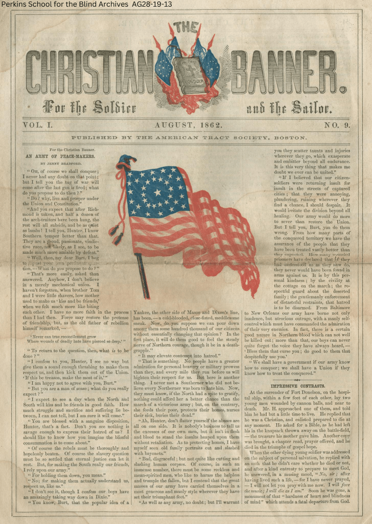 I stumbled across this image of the Christian Banner in the digital archives of Perkins School for the Blind. Julia Ward Howe’s husband, Dr. Samuel Gridley Howe, founded the institution, which is likely why this paper is in their collections.(8)