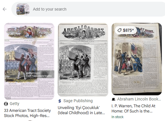 My usual process for searching for rare materials involves doing a quick google search and then slowly refining the results. On this occasion, I searched for “The Child at Home” 1870.
