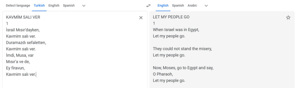 The melody was very familiar, but I couldn’t quite place it. After a bit of searching, I learned that a wonderful Turkish researcher had translated these lyrics from Karamanli Turkish into standard Turkish.7 I pasted them into Google Translate and instantly recognized it!