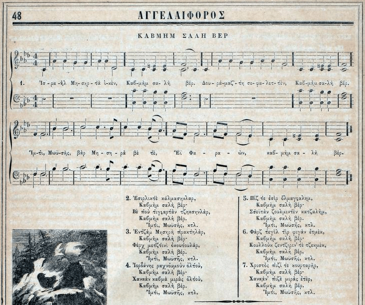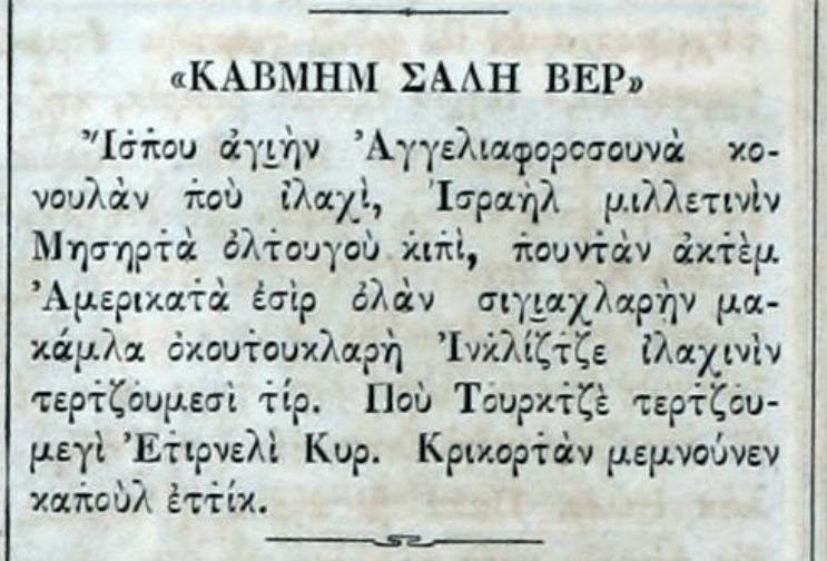 On a whim, I decided to dig a little deeper into ACI and found a particularly unique gem. The December 1874 edition contains a musical score titled: ΚΑΒΜΗΜ ΣΑΛΗ ΒΕΡ (KAVMIM SALI VER).6
