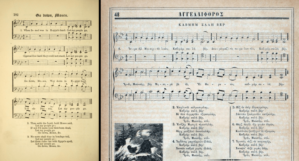 This is the popular African-American Spiritual titled: “Go Down, Moses.” The song predates the war, but the lyrics were first published in 1861 along with an original tune.8 Some years later, the song was popularized by the Fisk Jubilee Singers. They performed it and many others on a world tour; they even sang for Queen Victoria. The musical score in their book exactly matches the one in ACI.9
