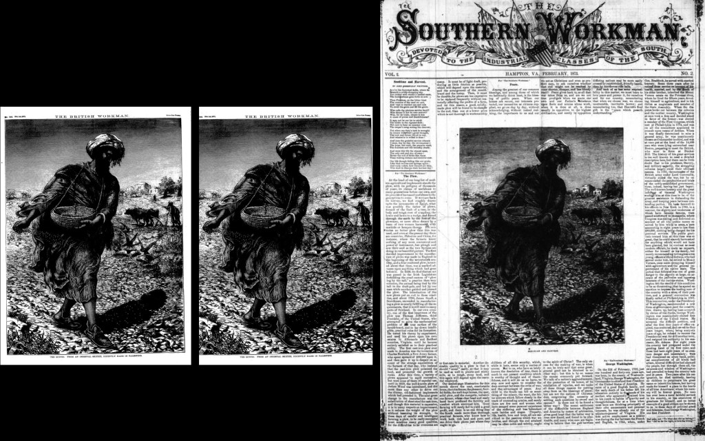 The Southern Workman began publication in January 1872. It was published in Virginia at the Hampton Institute, a historically black college founded by the American Missionary Association after the Civil War. As such, the intended audience for this paper was Black Americans. It included contributions by noteworthy Black authors like Frances Ellen Watkins Harper as well as a variety of correspondents. In it’s early years, the publishers of The Southern Workman didn’t have the ability to create their own illustrations; they relied entirely on donations. In an article from December 1872, they acknowledge that their illustrations came from several different publishers. So far I’ve identified images originally created by the American Tract Society in New York, The American Tract Society in Boston, and S. W. Partridge & Co. (publishers of The British Workman.) 14