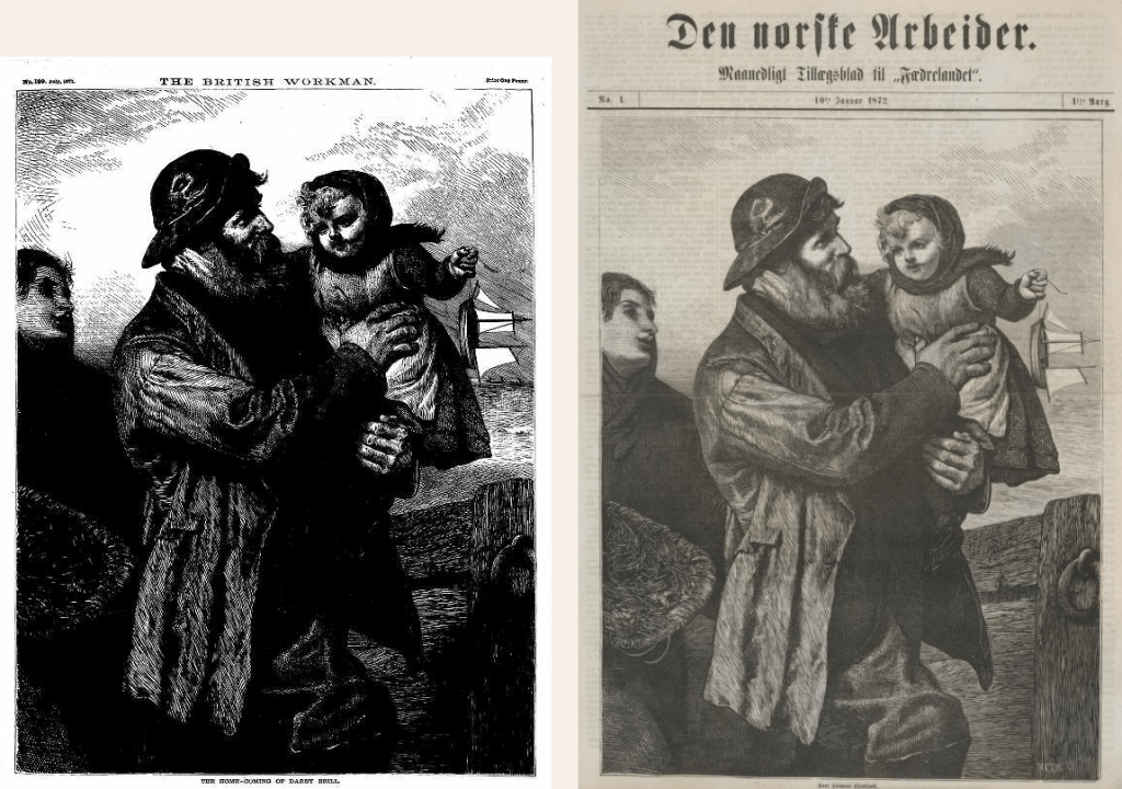 Den Norske Arbeider (The Norwegian Workman) also began publication in January 1872. It was edited by a Lutheran minister named Peter Lorenzen Hærem. He visited London in 1870 and personally met Smithies. So presumably Hærem made an agreement directly with him. During its first year of publication, it used many illustrations from The British Workman but the content appears to be quite different.
