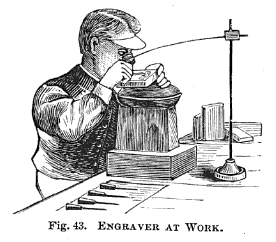 Engraving in this period typically involved two individuals. An artist would sketch the image directly onto a wood block and an engraver would carefully carve it out. This required extraordinary precision, so they typically worked while looking through a magnifying glass as depicted below.