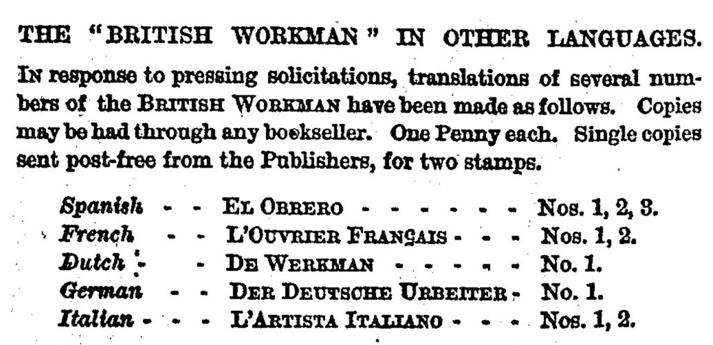 Jones, E. D. “News and Notes. Y Gweithiwr Preydeinig Neu’r British Workman Yn Gymraeg.” The National Library of Wales Journal (Aberystwyth) 12, no. 4 (1962). https://journals.library.wales/view/1277425/1281889/97#?m=42. ↩︎ - The British Workman (London). “The ‘British Workman’ in Other Languages.” March 1869. https://newspaperarchive.com/british-workman-mar-01-1869-p-2/. ↩︎