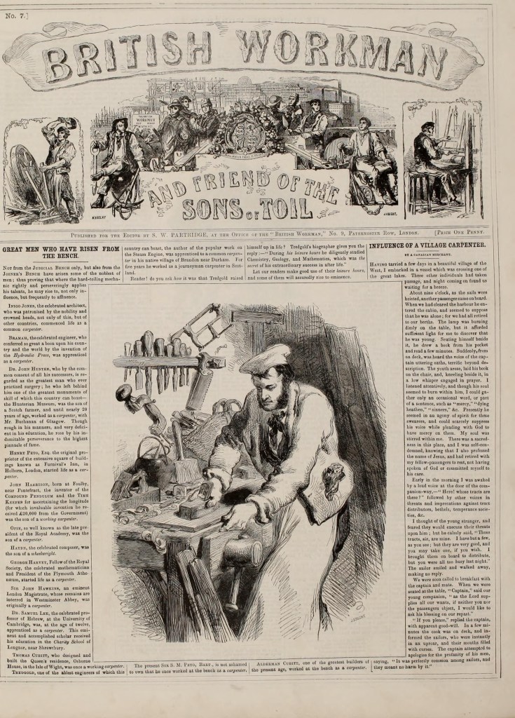 The Illustrated London News (London). “The Explosion at Lund Hill Colliery, Barnsley.” March 7, 1857. https://babel.hathitrust.org/cgi/pt?id=mdp.39015010948779&seq=196&view=1up. ↩︎ - The British Workman (London). “Great Men Who Have Risen From the Bench.” August 1855. https://archive.org/details/britishworkman1119lond/page/25/mode/1up.